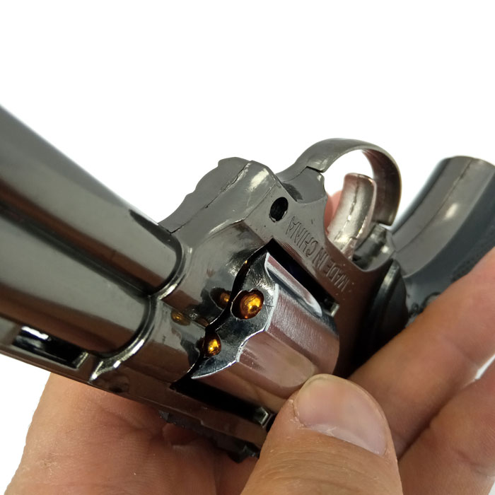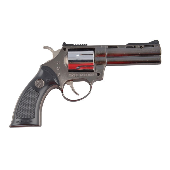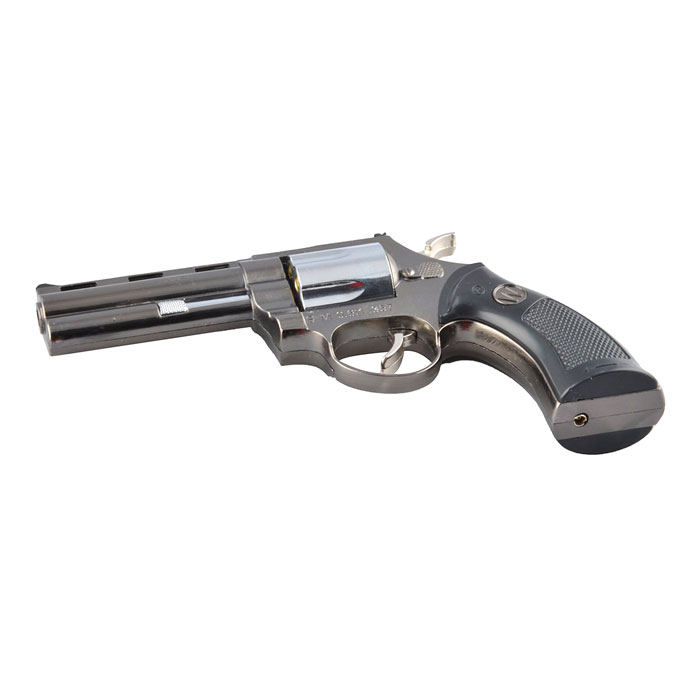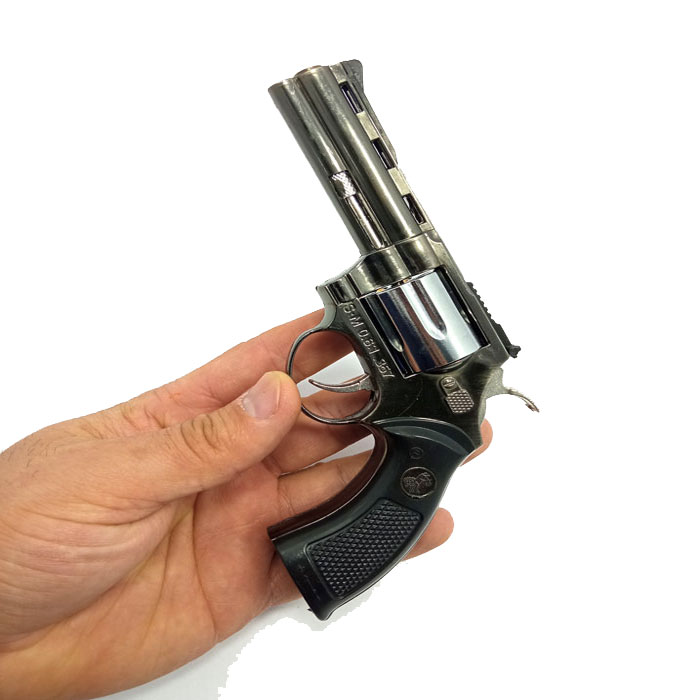 فندک طرح کلت مدل 357 به رنگ نقره ای/مشکی و شکل آن شبیه تفنگ است.