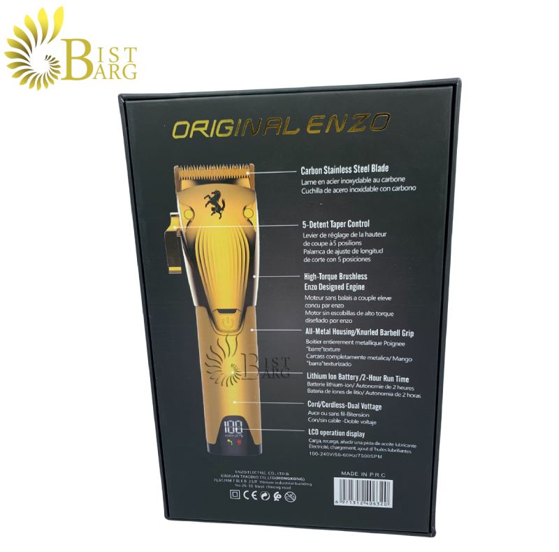 ماشین اصلاح ENZO EN-1929 ساخت کشور چین است، این محصول دارای باتری 2500 آمپری است، این باتری قابل شارژ است و مدت زمان شارژ کامل آن 2 ساعت است و مدت زمان استفاده از آن بعد از شارژ کامل 2 ساعت می باشد، همچنین لازم به ذکر است که این محصول دارای صفحه نمایش LED است و قابلیت تنظیم درجه را نیز دارد.