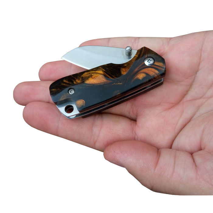 چاقو جیبی تاشو کوچک ظاهر بسیار زیبا و جذابی دارد که در همان نگاه اول، توجه شما را به خود جلب می کند. رنگ دسته چاقو مشکی است و رگه هایی از رنگ طلایی نیز در آن به کار رفته که جذابیت آن را چندین برابر کرده است.